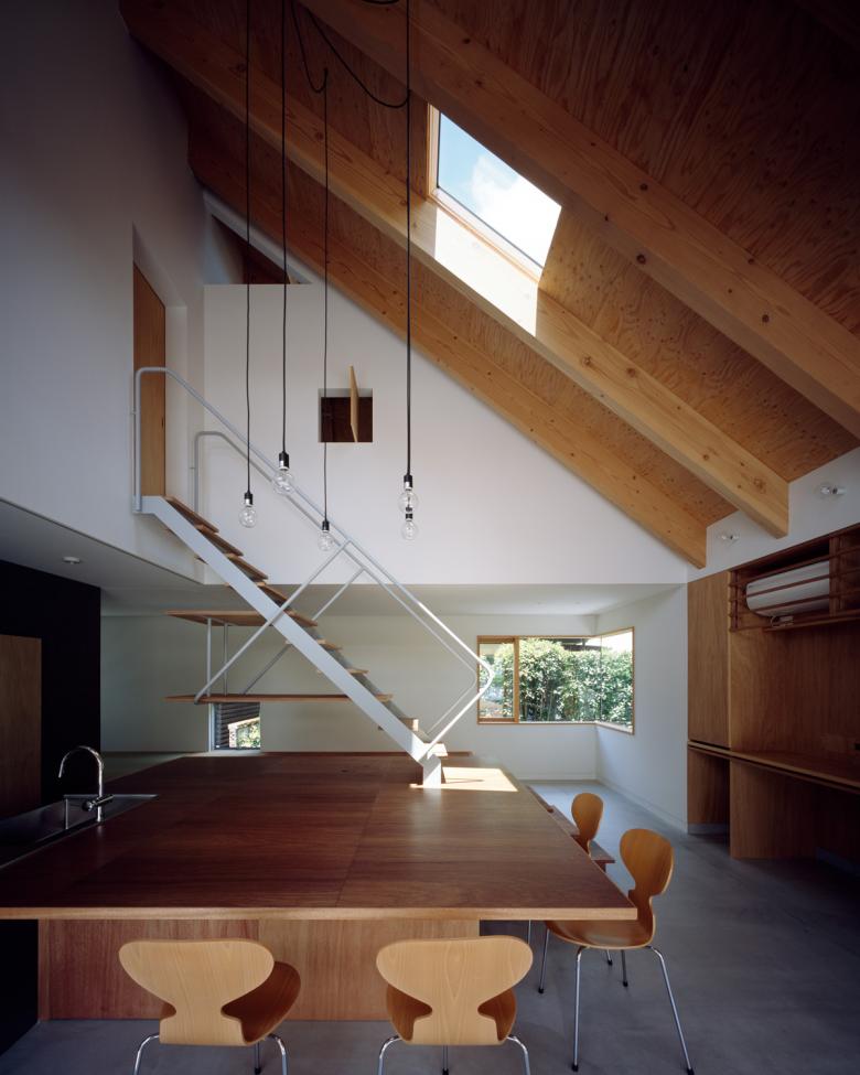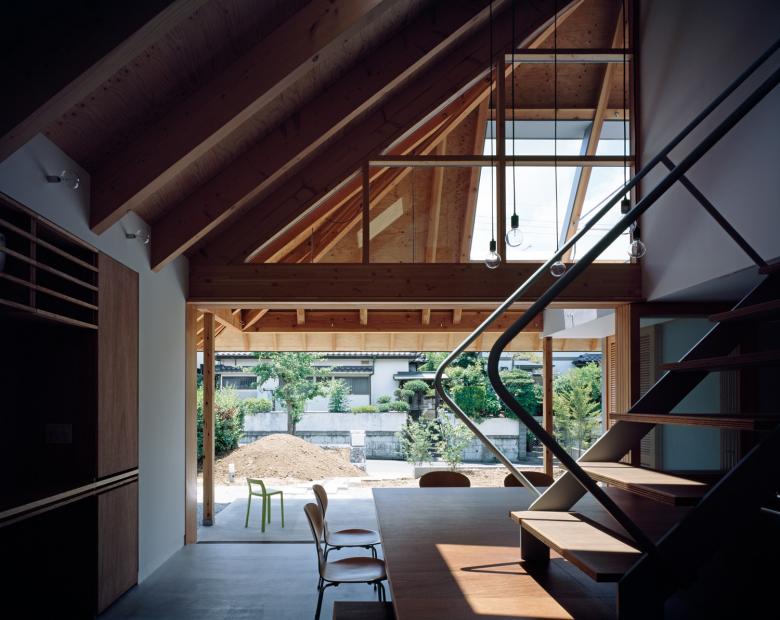 In order to create an open doma beneath the large, wood-framed roof, the roof is constructed from girders linked in 8-meter trusses arranged in a double-cross formation. These girders divide the space beneath the roof into six zones, each of which has a different character. The post and beams have been removed in one corner of the downstairs living area to allow a window to wrap around this corner, providing a view of the garden and gap between neighboring houses. This prevents the centrally located table from becoming the sole focus of the room; instead, the four-cornered space expands out to the surrounding environment, creating a step-wise connection between the exterior and the core of the house.