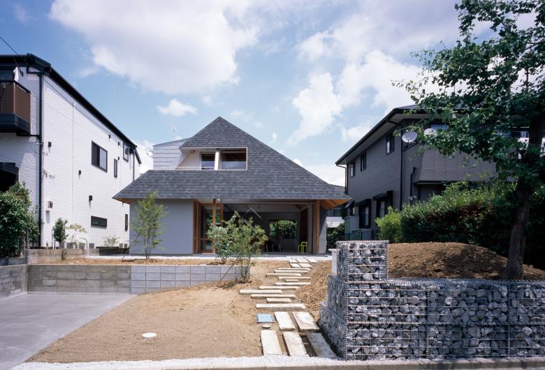 This residence is located in a suburban neighborhood that was developed about 40 years ago, with widely spaced homes lining a gentle slope that leads to a hill with a shrine on it. The neighborhood’s population has grown over the years due to generational changes and the opening of a new railway line, and as a result many of the original houses have been rebuilt, but nevertheless most retain a garden on the south side and a hip roof. This residence conforms to the contours of the land and the general mood of the surrounding homes, yet also represents an experiment in creating new relationships with the surrounding environment and community. A large roof shelters a spacious table measuring 3m x 3m that serves as a kitchen and dining surface, desk, and staircase. Activities in the home expand from this central table to a diversity of surrounding spaces, including an open-air area under the eaves and a raised sitting area with both wood and tatami-mat flooring. One corner of the house is carved out, with windows on the recessed walls linking the interior and exterior spaces. In contrast to this open first floor, which is linked to the street via an undulating garden, the second floor consists of a private space enclosed by the large roof.