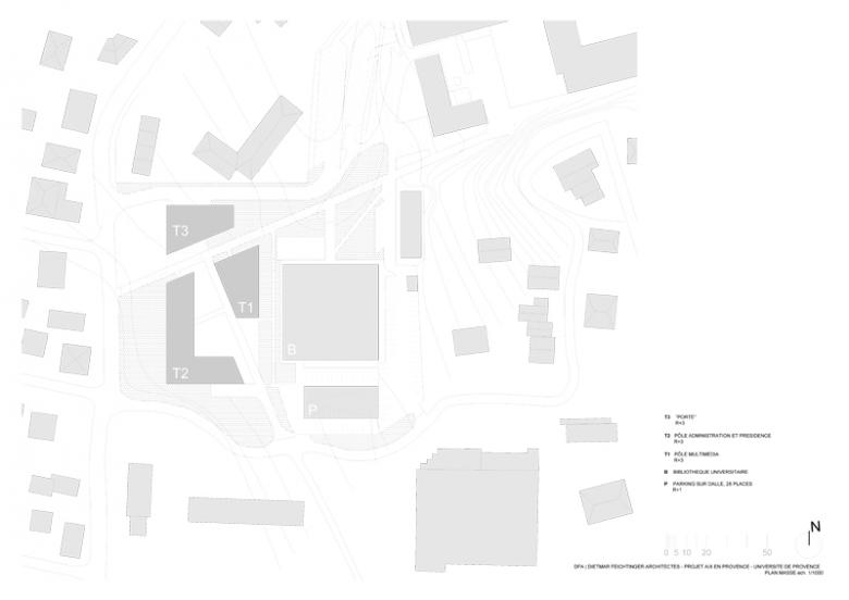 Eines der Wesensmerkmale des Campus von Aix-en-Provence, das aus seiner beengenden Topographie (ein sehr abschüssiges Gelände) folgt, ist die Existenz kleiner Plätze direkt vor den Gebäuden. Sie alle stellen Erholungsflächen entlang den Wegen über den Campus dar. Feichtinger greift dieses urbane Muster auf: Er teilt das Programm in drei kleine Blöcke unterschiedlicher Größe und Konfiguration und erzeugt so ein virtuelles Rechteck, dessen Mitte eine leere Fläche ist. Die Position dieses von den Straßen zurückgesetzten Ensembles vermeidet die direkte Konfrontation mit dem Kontext. Den Campus betritt man, indem man diesen Raum durchquert. Die Anordnung der Bauten lässt zwei Orientierungen entstehen, zwei Straßen, welche die Studenten entweder zu den Hauptgebäuden auf den Anhöhen des Campus oder zur benachbarten Bibliothek führen. Dieser ruhige Ort, der aufgrund seiner Proportionen mit einem großen Innenhof verglichen werden kann, bildet einen beruhigten Eingang in den Campus, sowohl im Hinblick auf den äußeren Kontext als auch gegenüber den schroffen Wegverläufen, denen die Studenten folgen müssen, um die einzelnen an den Hängen abgestuften Gebäude zu erreichen. (…)