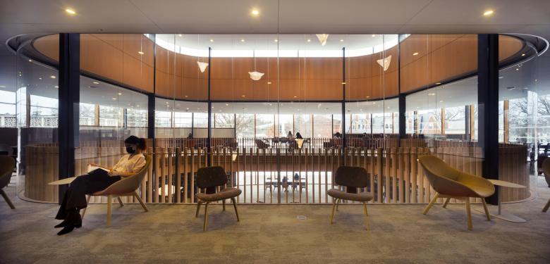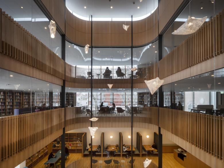 Lin's artist statement continues: "By preserving the exterior walls and original foundation footprint of the original Neilson, the new library retains the memory of the original structure and takes full advantage of building on the foundation of the library. But the interior speaks to the needs of students, faculty and scholars today, with more room for collaborating and socializing. There’s a café, plenty of room for digital tools, and even studios to record a podcast — but it’s still a home for books. I still believe in the beauty of ink and paper books."