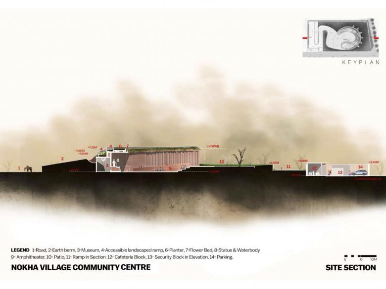 The site impacted the design in multiple ways. The orientation of the open court towards the north; the use of natural sandstone from the vicinity; the earth berm on the east, west, and south to mitigate heat gain; the grass roof to reduce heat — all are climatic responses based on the sun orientation.