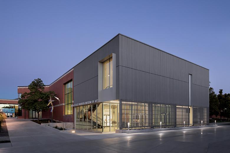 The façade design is composed of linear vertical panels of opaque and perforated zinc, referencing the materiality of the Performing Arts building but with a unique pattern and design approach. The porousness of the lower half of the façade invites glimpses into the museum by the passerby, and at night the activity and exhibitions housed within glow through this façade. By separating the perforated zinc screen from the building envelope at the entry level, the campus circulation flows directly into and through the museum. The façade creates a space of transition and entry along this perforated veil and softly defines the edge of the campus arts node. This welcoming entry sequence invites students of all disciplines to consider the role of art both within their academic discipline and the tradition of the American Land Grant College.