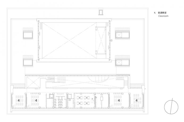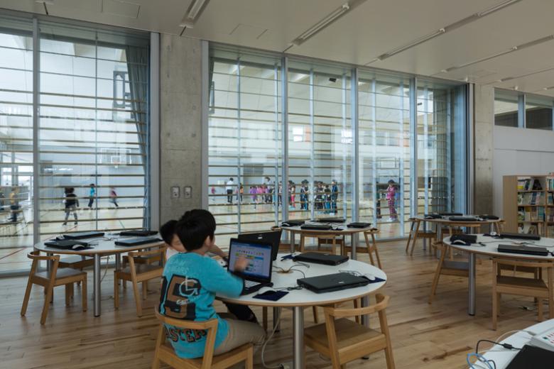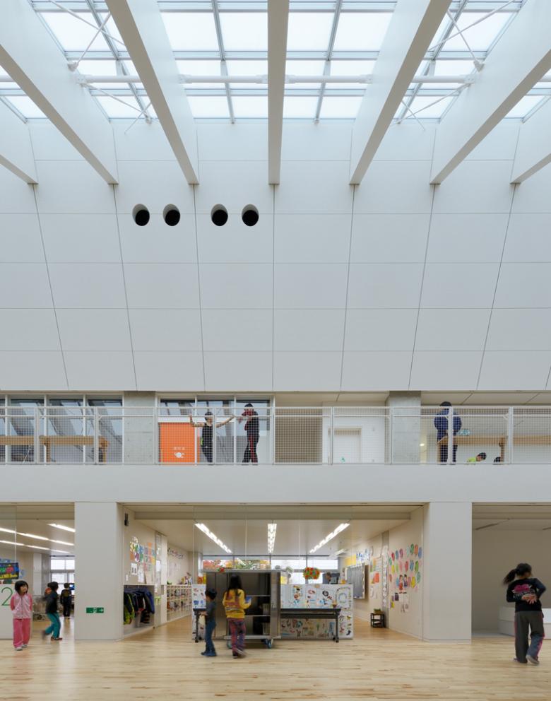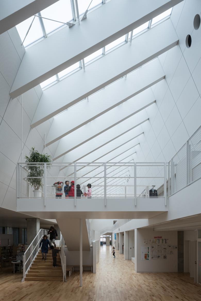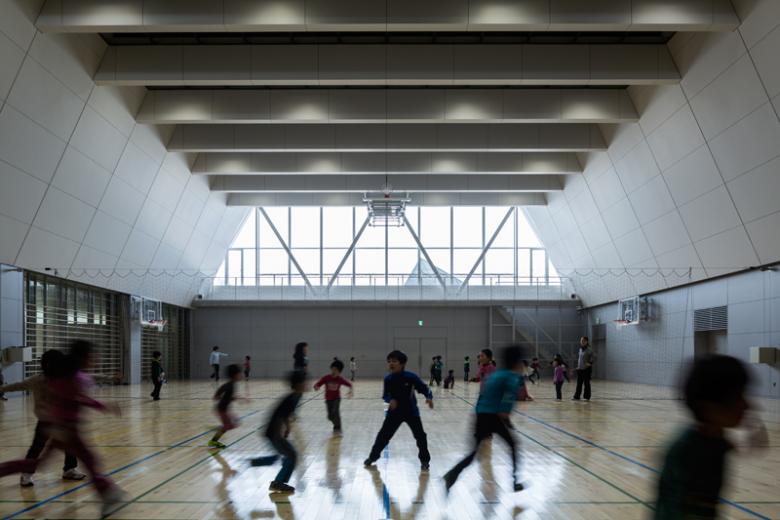 In order to reduce heating demand, which accounts for the majority of energy use, we designed a compact rectangular building with as little exterior wall surface as possible. This lent the plan a feeling of unity, with the classrooms, gym, and other rooms closely linked to one another. Because the cold and snow limit outside activities, the children spend most of their time inside, making this type of expansive interior space quite meaningful.
