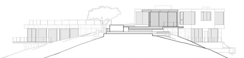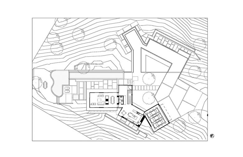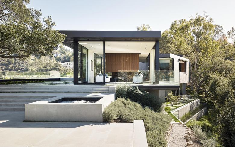 The main house is the second phase of a two-house development on a 3.5 acre hillside side in Beverly Hills. The main house is approximately 8,000 s.f. and consists of five bedrooms below a vegetated green roof, one lap pool and one swimming pool.