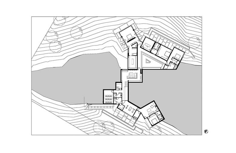 Topography and trees were critical. In California, the Coast Live Oak is protected and cannot be touched, so the houses had to be designed around them. I also understood that, given the natural beauty of the site, it would be important to make the relatively large house as diminutive as possible. To achieve this I placed 2/3 of the program below grade and much of it under a vegetated roof. Because the house is sited on a ridge, the lower level was still able to have commanding views and vistas from nearly every window. I wanted to showcase the view of one of the more majestic Oaks on the property so I placed the lap pool below the Oak so it would reflect the tree and placed a smaller section of the house alongside it as a pavilion. It was important on this site to make it feel like nature was coming first, and the house second.