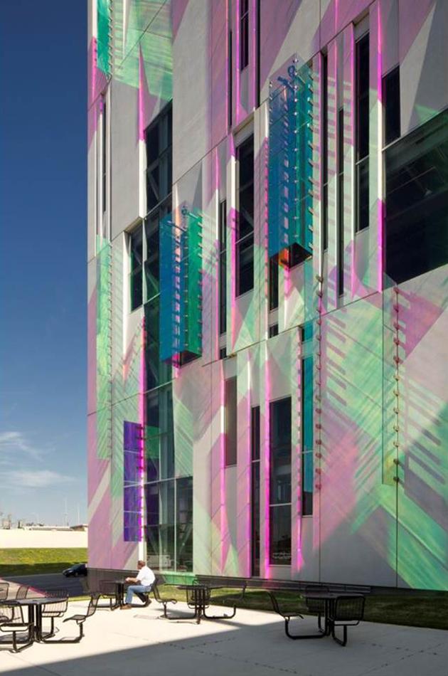 The dichroic fins were added to the façade to activate the exterior using energy from the sun.  We have been interested in the properties of dichroic coatings for a while. A dichroic film is created by adding micro thin layer of metal to a translucent material. The metallic layer changes the wave length and therefore the color of light passing through. Since the metal is also reflective the dichroic produces different reflected and transmitted colors. It turned out to be a very dynamic expression.  Producing the large pieces of laminated glass for the fins turned out to a bit of a technical first. We worked closely with Goldray Glass to discover the proper lamination.