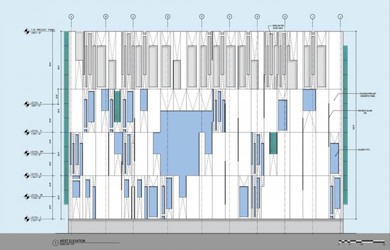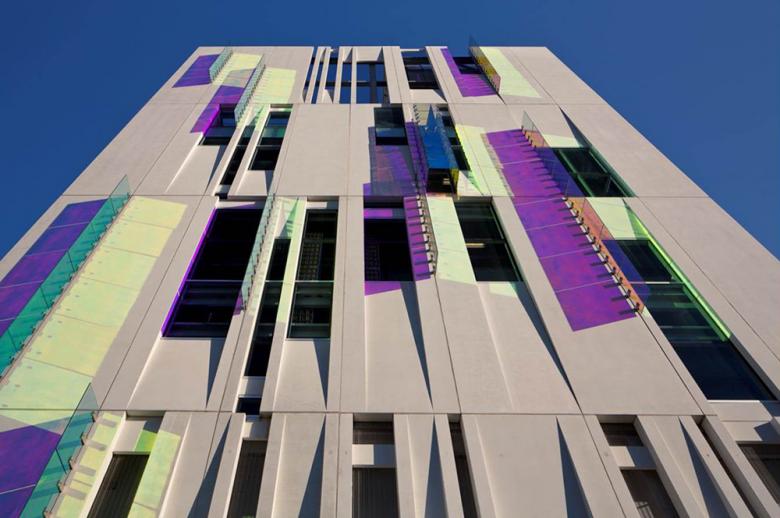 Dichroic glass fins are located in the joints of the polished precast concrete panels