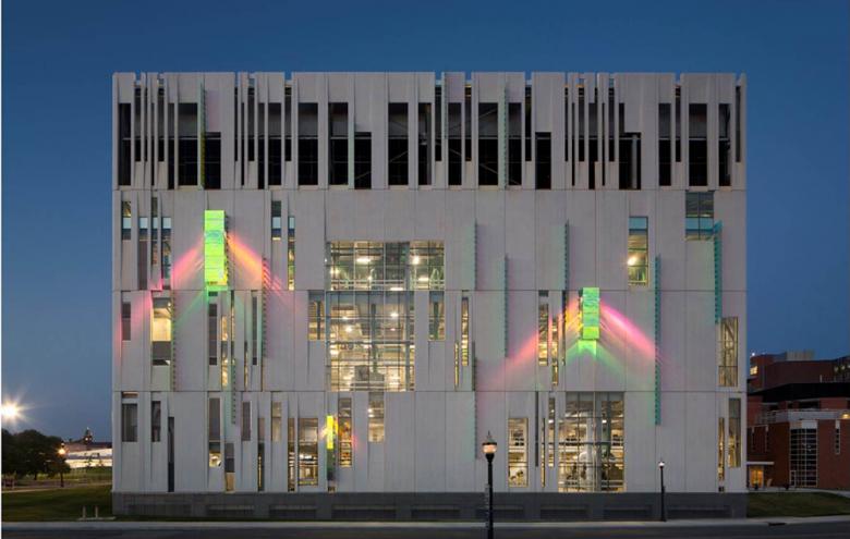 The final solution depends heavily on material selection and detail.  Originally, there was a prejudice to enclose the Chiller in glass, expressing the inner workings of the chiller to view.  But we learned that with a glass box design we would have to add cooling to the building, literally chill the chiller.  So we began looking for an alternate solution and precast concrete was chosen for its thermal properties.  The completed building is naturally ventilated and does not require supplemental cooling…or heating for the matter. In the winter, the heat created by the operating chillers keeps the facility warm. One more interesting precast note: The University was not pleased with earlier precast installations on campus because of staining and streaking. To solve this, our panels were polished before installation. So far it is working.