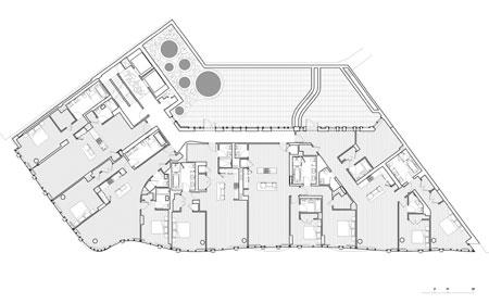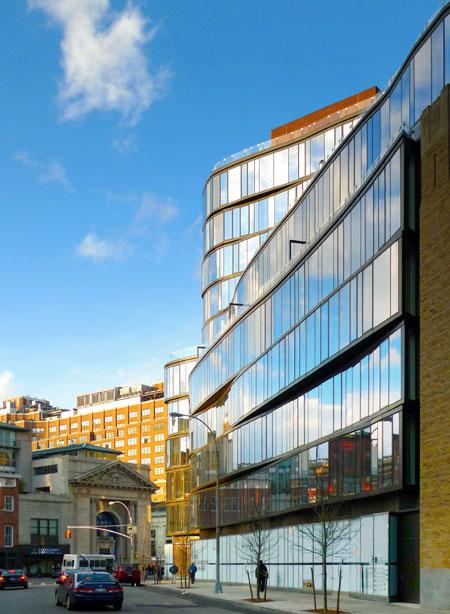 The process involved a heavy community group outreach program and required a Landmarks Preservation Commission certificate of approval since the site falls within a historic district. The complex massing of the building was a given from the zoning volume of the site. We could have revised the zoning volume and proposed something else but it would have meant a longer urban review process. The as-of-right form proved difficult to fenestrate so we developed an undulating wall strategy that allowed us to unify the disparate form.