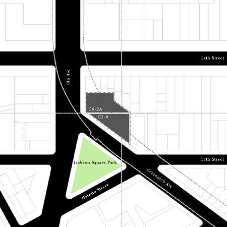 The project was a response to an RFP. The new building is located at the northern edge of Jackson Square, at the convergence of Greenwich and Eighth Avenues, where opposing street grids collide to create a six-sided, wedge-shaped project site spanning two different zoning districts.