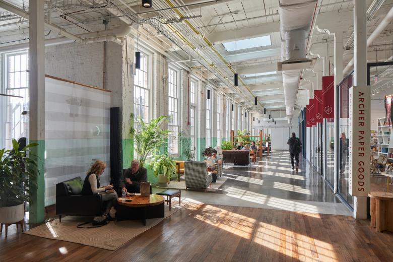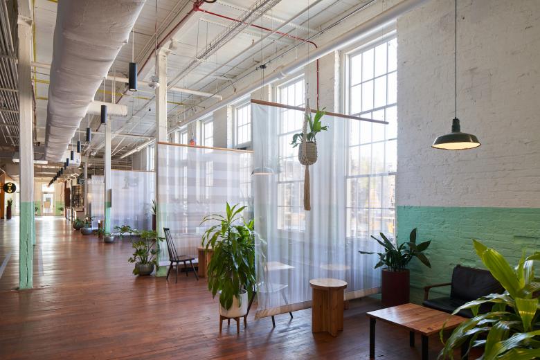 Repurposed old factory windows found in the basement along with light translucent woven scrims are used to create partition screens around intimate 8’ x 8’ “micro lounges,” utilizing the building’s original structural module designed to fit common weaving and spinning equipment of the time. Decorative lighting in the food hall is entirely composed of reclaimed factory pendants, also found in the basement, which are rewired and otherwise largely left in their found and aged condition.
