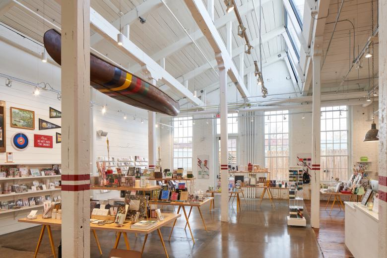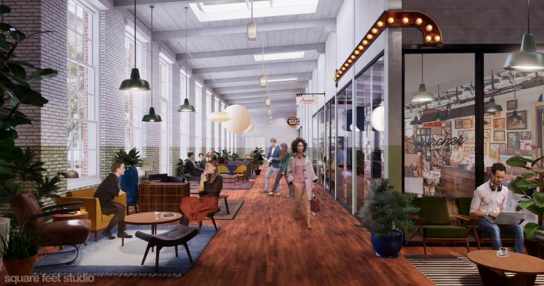 Drawing inspiration from the spinning and weaving processes that once activated the building, we designed custom furniture using reclaimed heart pine and raw steel. Decorative lighting is provided by the old enamel warehouse pendants found in the basement during demolition, which we had rewired and listed for commercial use. The space is peppered with potted plants which thrive on the abundant natural light pouring in through the original windows. The food hall features fifteen stalls, a bar stall (also designed by Square Feet Studio), a brewery tasting room, three anchor restaurants, a game parlor bar, outdoor dining courtyard, and generous common seating.