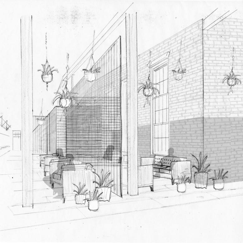 The courtyard features an array of decidedly southern Magnolia trees planted in herringbone-patterned wood planter boxes. Hand-crafted cypress furniture lines the exterior edges of the old mill building while lightweight and playfully colored metal furniture is scattered within a central graveled area, making sweet subtle reference to an image of 20th century post-war yard parties conjured by the gingham fabric traditionally produced in the factory.