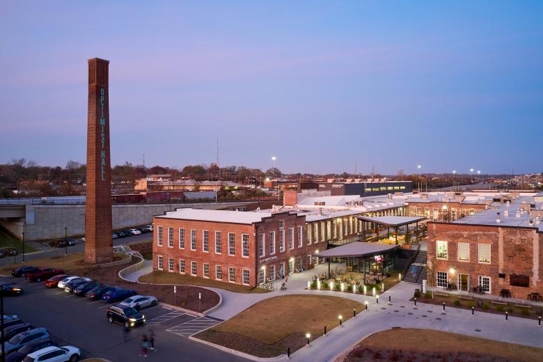 Optimist Hall is a 60,000 square foot adaptive reuse project located in Charlotte, NC along the city’s Lynx light rail system. The project occupies a historic textile mill dating to 1881 and designed by then-famed New South industrialist and designer D.A. Tomkins. Perkins + Will was the architect for the core and shell and we designed the food hall and outdoor dining spaces.