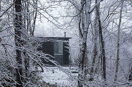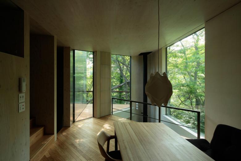 By covering one part of the wall around the triangular terrace with reflective aluminum panelling, I was able to bring the changing colors of the forest into the home in an abstract form. The triangular shape surrounded with glass and aluminum also serves as a megaphone that amplifies surrounding sounds and brings them into the house. I expected this to happen but it ended up working even better than I’d thought it would. In addition, I had hoped the exposed-beam ceiling would add a sense of expansiveness and light to the space. Once it was built  I discovered it reflected the colors of the forest in ways I hadn’t imagined.