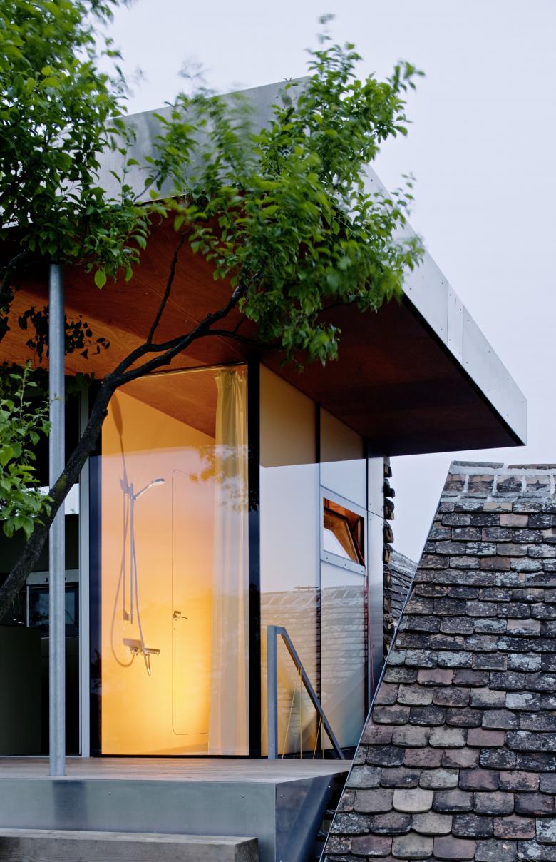 Die leichte Raumkapsel mit dem sonnigen Panoramaglas sitzt direkt auf der Hügelkuppe. Um ihr Platz zu machen, wurde dem Hof neben der Durchfahrt ein Eck vom Dach gekappt: An der kalkverputzten Seitenwand des Schuppens führt nun eine Stahltreppe mit rutschsicheren Noppen direkt auf die Terrasse des neuen Hauses, das die ideale Ergänzung zum alten bildet. Am Platz mit der besten Aussicht hakt es sich gleichsam in den Hof ein. „Es ist so schön hier, weil der Unterschied zwischen den Räumlichkeiten so groß ist“, sagt Carmen Wiederin. „Wichtig war uns, den Garten ins Haus zu holen.“ (…)