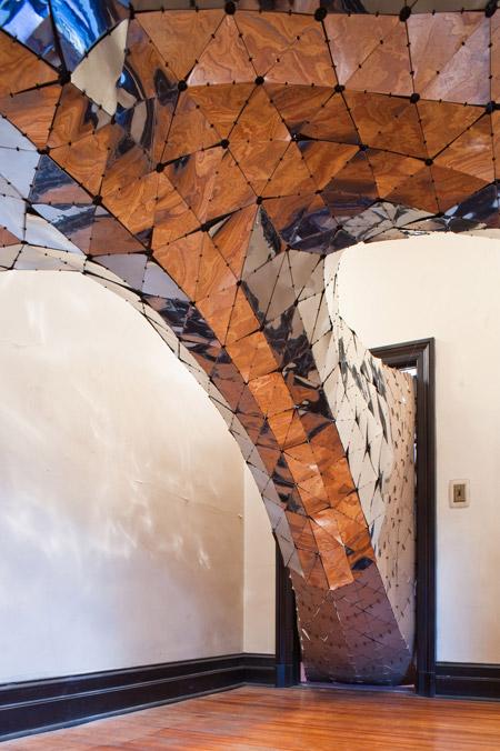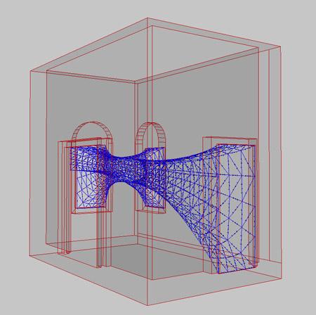 The project is very site specific. The site is an old convent with many rooms. We knew that we wanted to produce a piece of geometry that connected all of the openings in the room, but we didn't know which room we would be able to work in until a month before the opening. So we devised an approach and measured the room as soon as it was confirmed and available. The installation is also contingent on research that is currently ongoing in the studio. We have been developing it for a couple of years and fortunately the geometry we created lent it self to this system.
