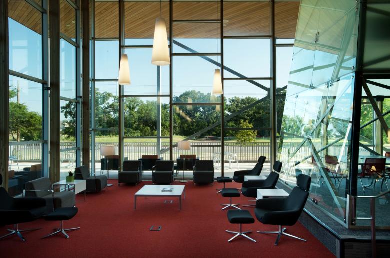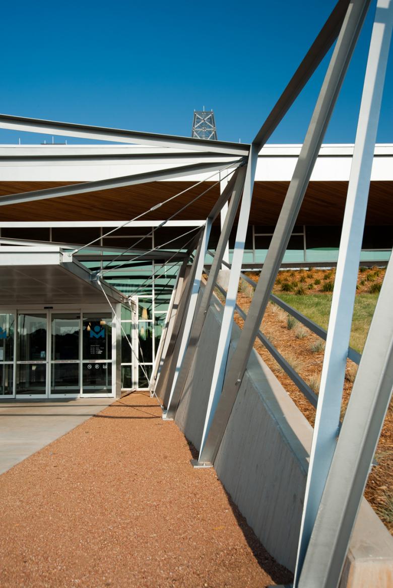 The iconography of Oklahoma is known for its burning sunsets, emblazoned sky over endless prairie grass, silhouetting the elements of industry and agriculture. The horizontality of the landscape permits extensive uninterrupted vistas of the sky. The native prairie grasses have gradually given way to agriculture, windmill towers and the ever prolific oil derrick, which can be seen all over the landscape. The trussed towers of the windmill and oil derrick structure were main inspirations to the design. Rolling prairie fields have been captured in the form of the large earthen knolls that surround and anchor the building in the landscape.