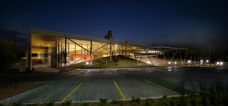 Exterior view showcasing the bermed earthen knolls and Oklahoma derrick theme