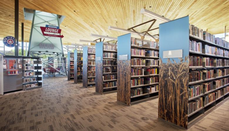 There really is nothing in Oklahoma to compare it to. Instead the facility is indicative of the rolling prairie of the region, silhouetting the elements and iconographic features of Oklahoma and its homage to the agricultural and energy industries. Large areas of interior wood elements, know to the design as “Crate Form,” wrap the interior offices and ceilings, along with other features that give a glimpse into Oklahoma’s past dust bowl days and shanty towns occupied by the early rough necks. The storm shelter room, which also serves as the Children’s Program Theater, offers a vast array of faux piping and other elements depicting the “pump shack” commonly found on an oil field site. Bermed earthen knolls represent the rolling Oklahoma Prairie and are planted with a native tall grass known as Buffalo Sod. All signage and wayfinding has been designed around Route 66 icons/emblems. Book stack end panels depict pictorial scenes iconic to our state such as oil field equipment, prairie grasses, windmill vanes, and burning sunsets.