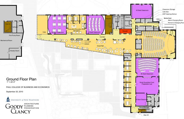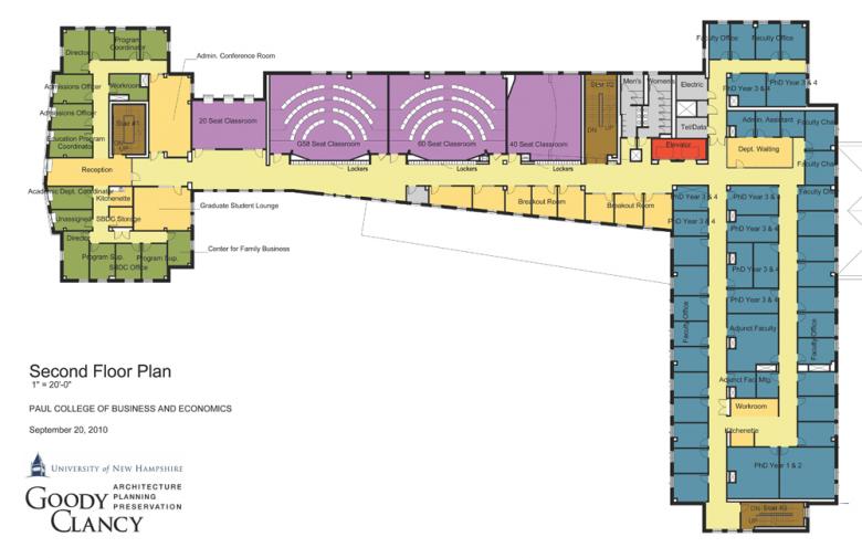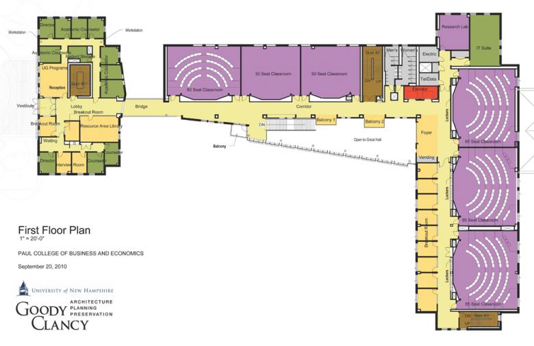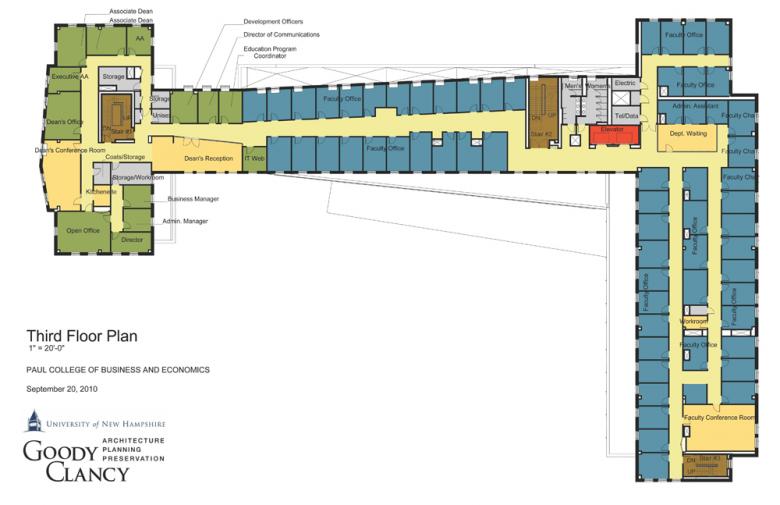In 2001, Goody Clancy was selected through a competitive RFP (Request for Proposals) process to develop a building program and concept design to add to the business school’s then current building. That project was not completed. In 2009, UNH elected to build a new building for the business school and issued a competitive RFP to update the program, select a site, and design the building. Goody Clancy was again selected for this work, which led to the construction of the Peter T. Paul College of Business & Economics.