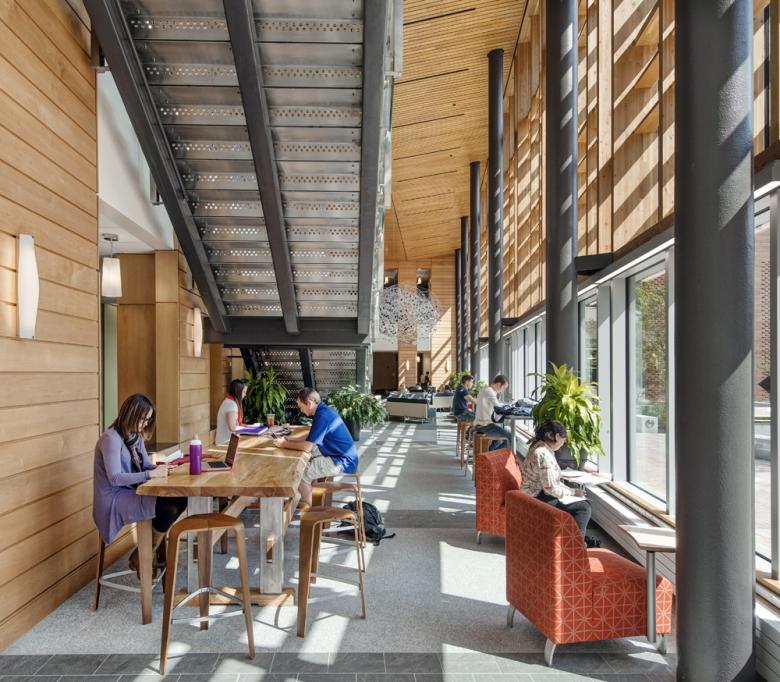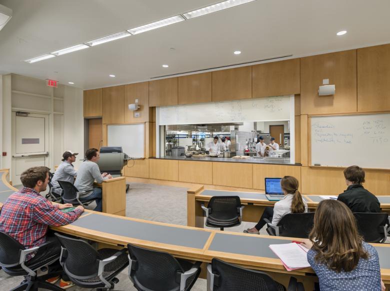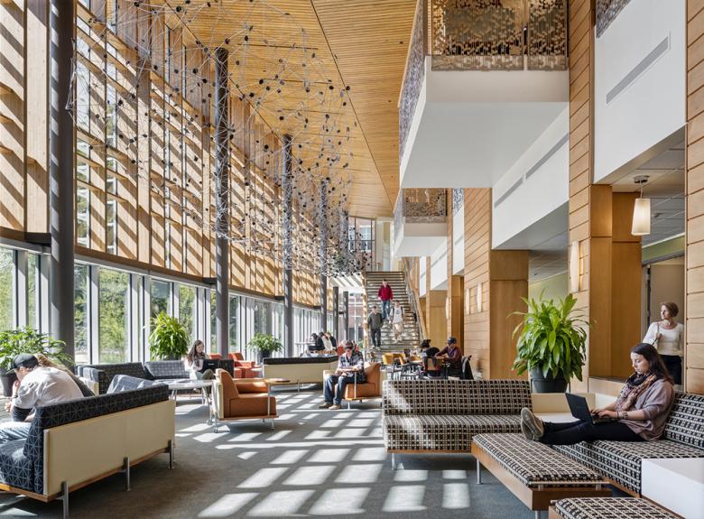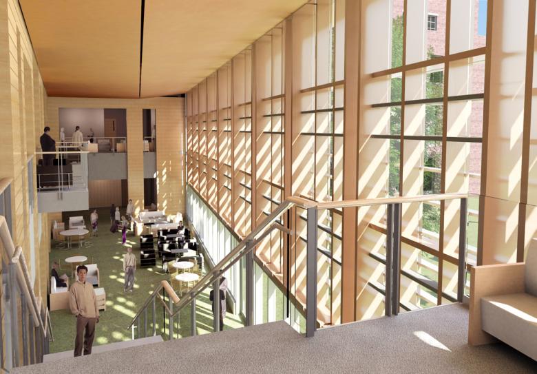 Designed with a traditional brick façade to fit into the surrounding historic campus, this new building offers undergraduate, graduate and executive business students technology-enabled breakout rooms, classrooms designed to accommodate a range of teaching methods, and a unique hospitality management program. A bustling hub for learning and collaboration, the building houses several departments and draws students from across campus. A two-story, light-filled atrium provides social and study spaces, with views of the beautifully landscaped courtyard.