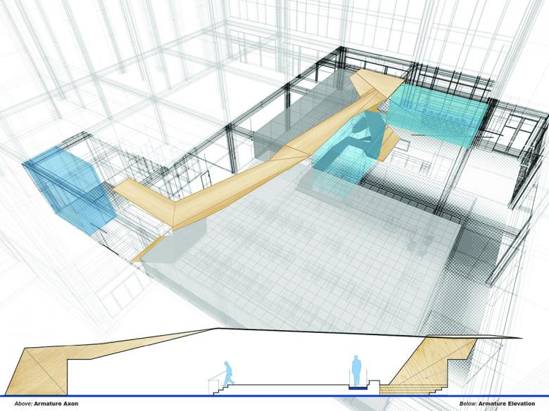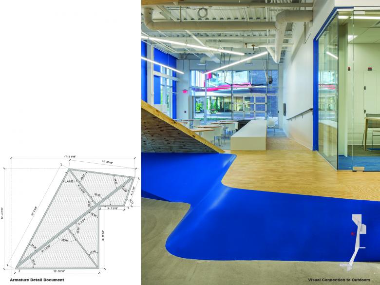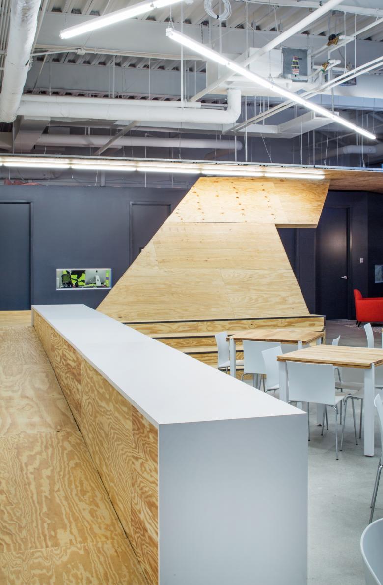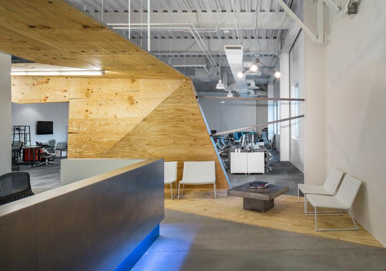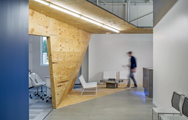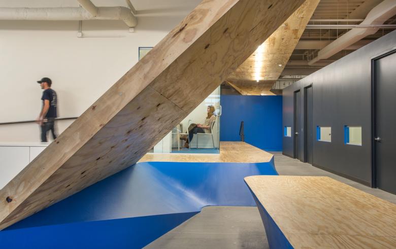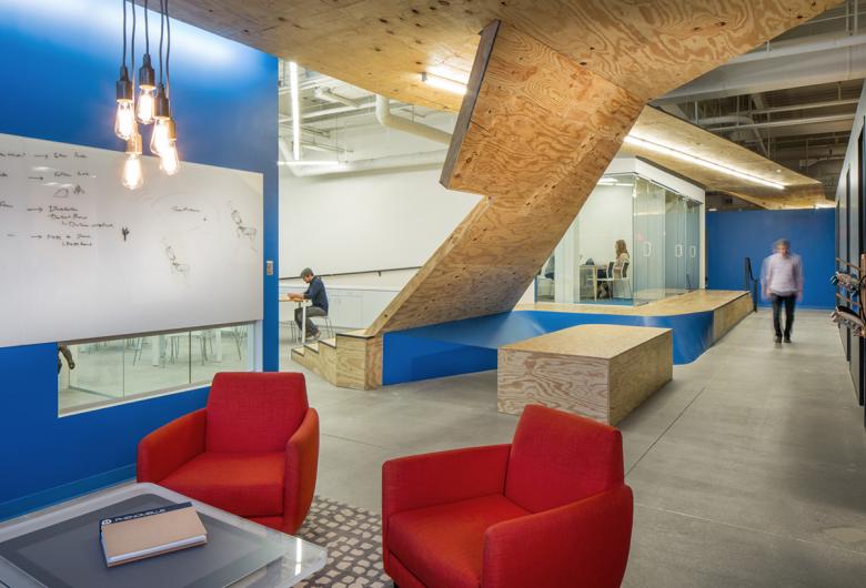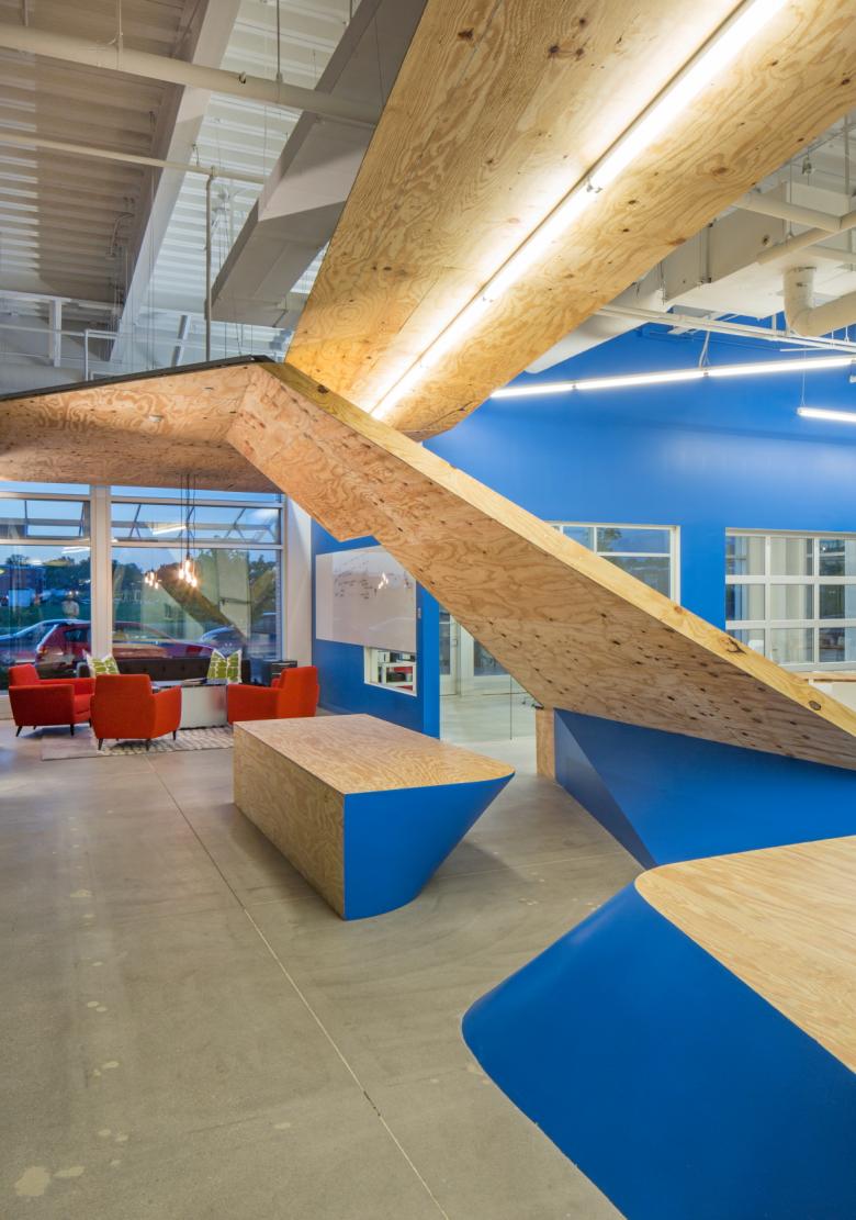 We used an “armature” as a way to organize the space into clusters, and as a way-finding element. The armature became a folded and angled plywood clad steel floating ceiling plane, which touches down in areas where collaboration occurs. It also defines the space between open work areas and circulation paths. The use of bold color assists in the playful nature of the space, as well as reinforcing the client’s brand and culture.