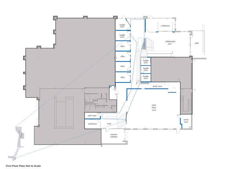 Our design of a tenant space within the Aksarben Village Development consists of a reception area, two conference rooms, three huddle rooms, an open office area for 30 employees, five enclosed offices, and a café/breakroom.