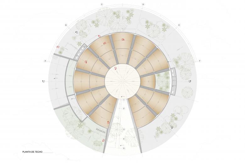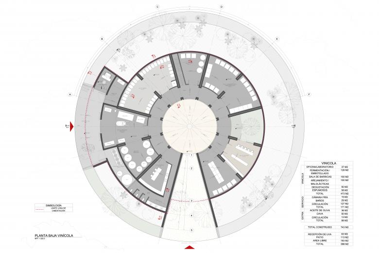 With a surface area of 1,963 m² (21,130 sf), the winery is organized around a circular floor plan with a radius of 25 meters (82 feet). The structure is composed of 12 trapezoidal radial walls of reinforced concrete that organize the different areas of the architectural program: tasting rooms, fermentation tanks, bottling areas, barrel storage, laboratories, and a maneuvering yard. In the center is a 113 m² (1,216 sf) courtyard, with a brick pavement laid out in a radial pattern. The building is surrounded by a slope covered with native vegetation, which visually integrates it with the surroundings, preventing it from being visible from the outside at the access level.