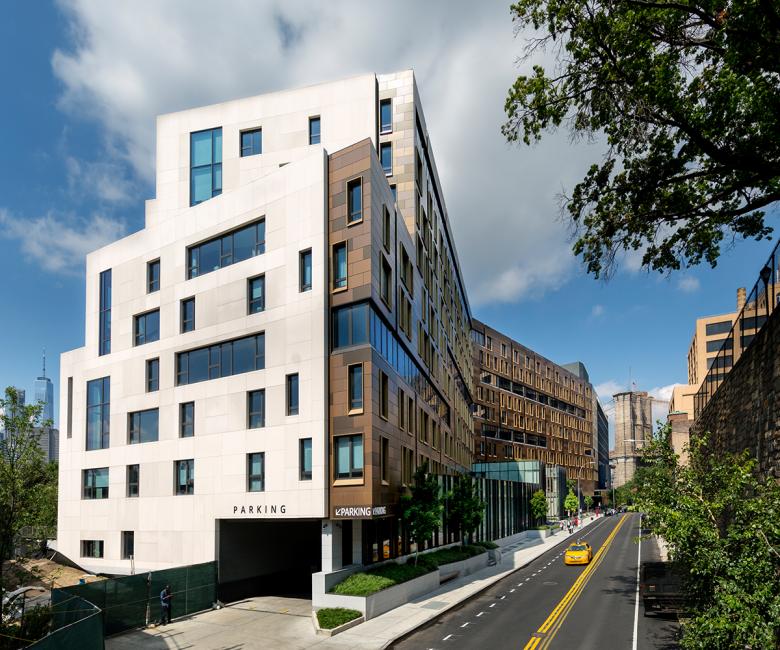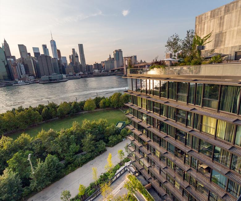 Situated along the river, well below the Brooklyn Heights Promenade and Brooklyn Bridge walkway, every face of the building – including the rooftop – is visible to the public. Intensively planted rooftops and terraces serve as the "fifth façade" of the building, complementing the park for outside viewers and providing recreational space for hotel guests and residents. Landscaping continues at grade, where ample public pass-throughs are dotted with trees and blocks of granite that provide shaded seating and extension of the park experience throughout the development. This prominent topography and intensive planting would become a significant factor in the resiliency of the project.