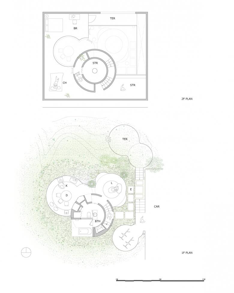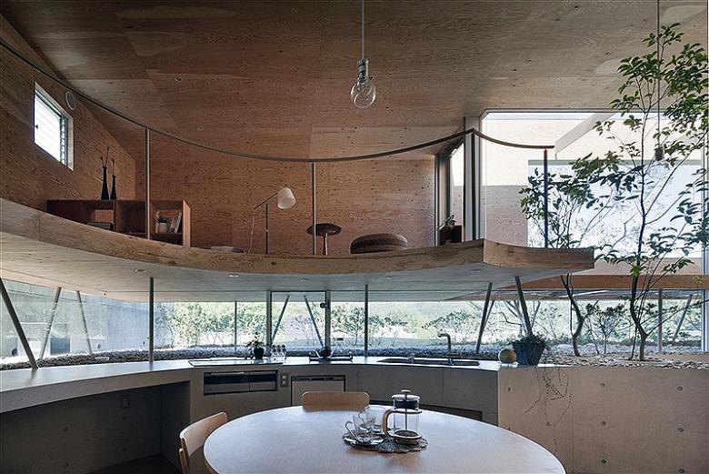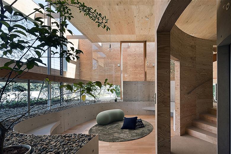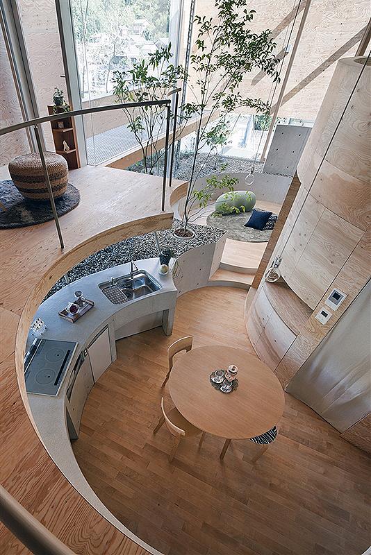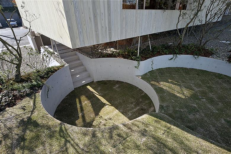 In order to play up the ambiguous sense of distance created by a round shape, which tends to eliminate the feeling of being closed in, we reduced the actual size of the home to the bare minimum. To keep costs down and make the best use of the space, we left the one-meter-high underground foundation supports exposed and incorporated them as an element of the interior. Making these small circular slabs required special precisely-constructed concrete formwork, which we developed through consultation with the building contractor. We also worked with a plywood factory to develop an experimental curved 6mm structural plywood that we used as a finishing material in the central section of the house. Our back-and-forth with the contractor and factory allowed us to acheive a high level of precision and expression that in turn was the key to creating a sense of continuity between the exterior and interior spaces.