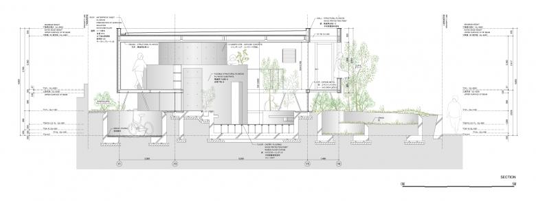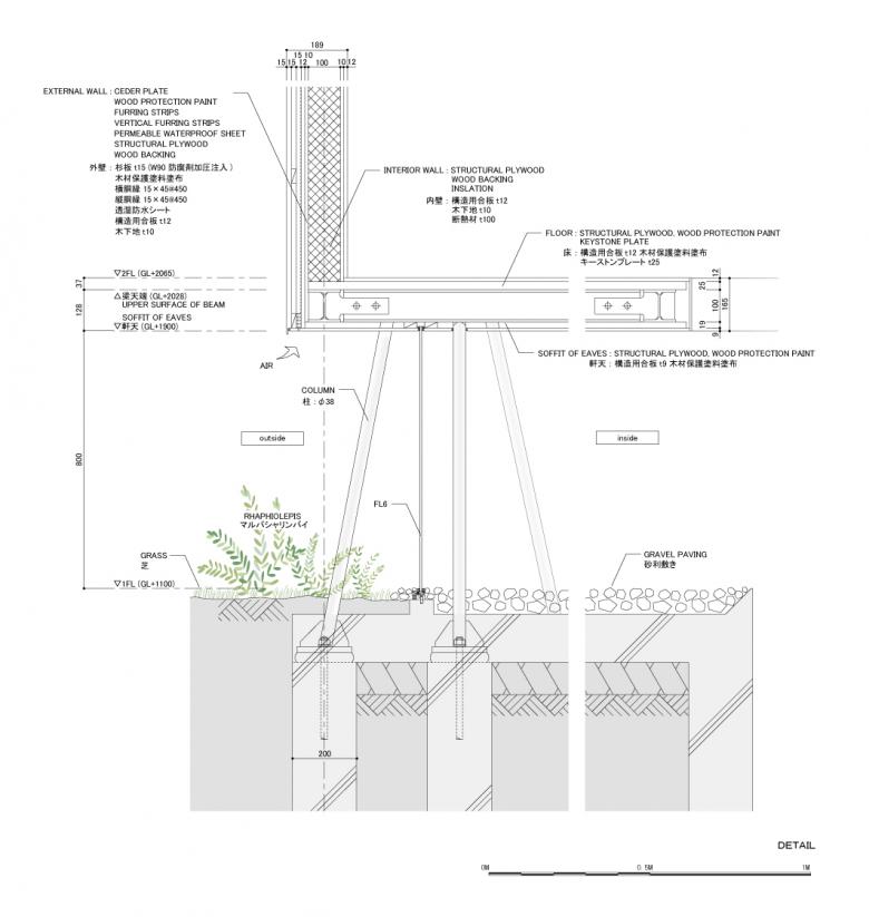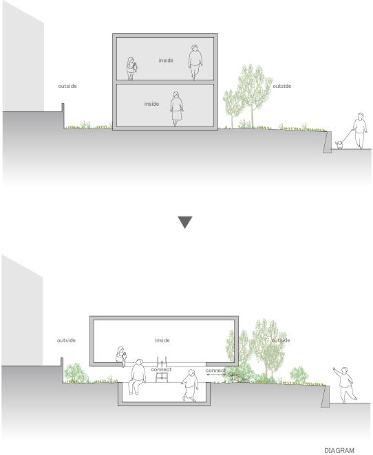 Exterior and interior are linked through the gap below the floating upper story, resulting in an ambiguous space.