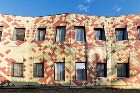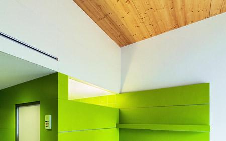 Das Erdgeschoß übernimmt die über 4 Meter Raumhöhe des Bestands: hier atmen die Zimmer mit den Holzdecken die Großzügigkeit des Altbaus und bildet die Fassade am Boden vor den Fenstern trapezförmige Pflanzbeete aus. Als Ausgleich dazu ist die Wand im ersten Stock stärker geneigt, wodurch mehr Tageslicht einfällt. Die Fassade ist mit roten und gelbgrünen Eternitplatten verkleidet, die nach einem Algorithmus aus Spiegelung und gradueller Addition verlegt sind. Ihre Farbanteile reflektieren die Umgebung. Parkseitig dominiert das gelbgrün, je mehr sich das Heim dem ziegelgedeckten Bestand nähert, umso röter wird es.