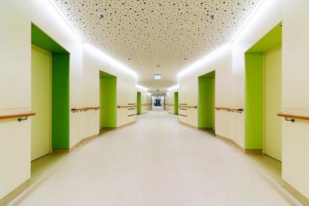 „Unsere Bewohner sind zwischen 60 und 95 Jahre alt,“ sagt Rudolf Schön, der Direktor. „Wir haben den Standort gewählt, um Synergien mit dem Krankenhaus zu nutzen. Wichtig war uns, dass die Menschen ins Freie können und ihren Lebensabend nicht im Zimmer verbringen müssen. Im Ulrichsheim war das umöglich. Es gibt hier viel Bewegungsfreiheit.“ (…)