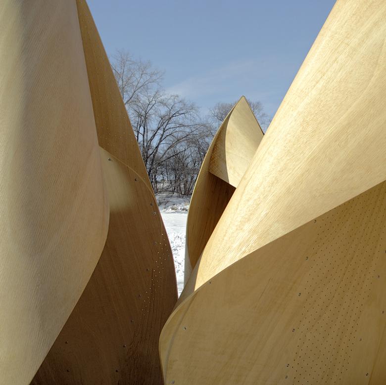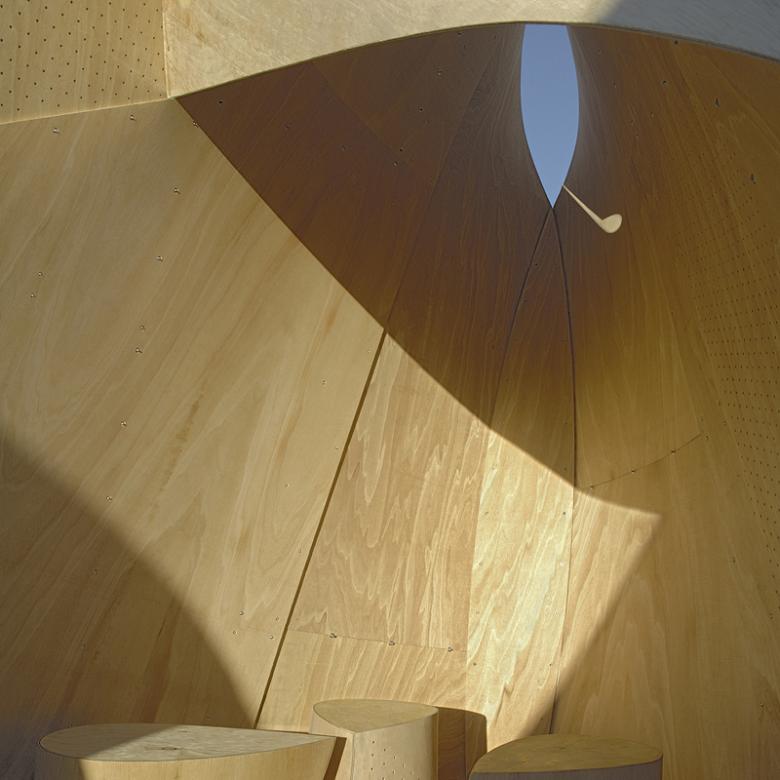 Each shelter is formed of thin, flexible plywood which is given both structure and spatial character through bending/deformation. Skins, made of 2 layers of 5mm thick flexible plywood, are cut in patterns and attached to a timber armature which consists of a triangular base and wedge shaped spine and ridge members. Experiments in their workshop with a full-scale prototype mapped the stresses of bending. Stress points were relieved by a series of cuts and openings.