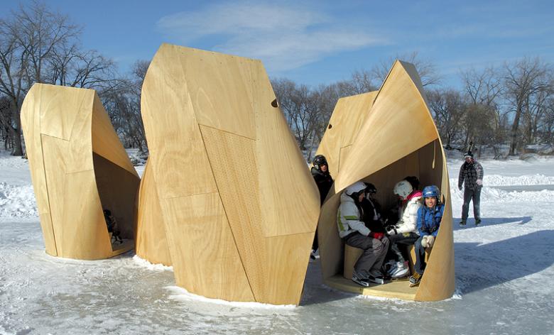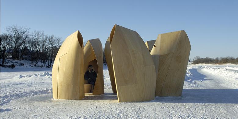 Therefore, an annual program has been developed to sponsor the design and construction of multiple temporary shelters located along the skating trails. Patkau’s proposal consists of a cluster of intimate shelters, a serene set of six lanterns each accommodating only a few people at a time. They are grouped in a small village or flock, to form a collective of something, irreducible to a single interpretation. They stand with their backs to the wind like buffalo, seeming to have life and purpose as they huddle together shielding each other from the elements.