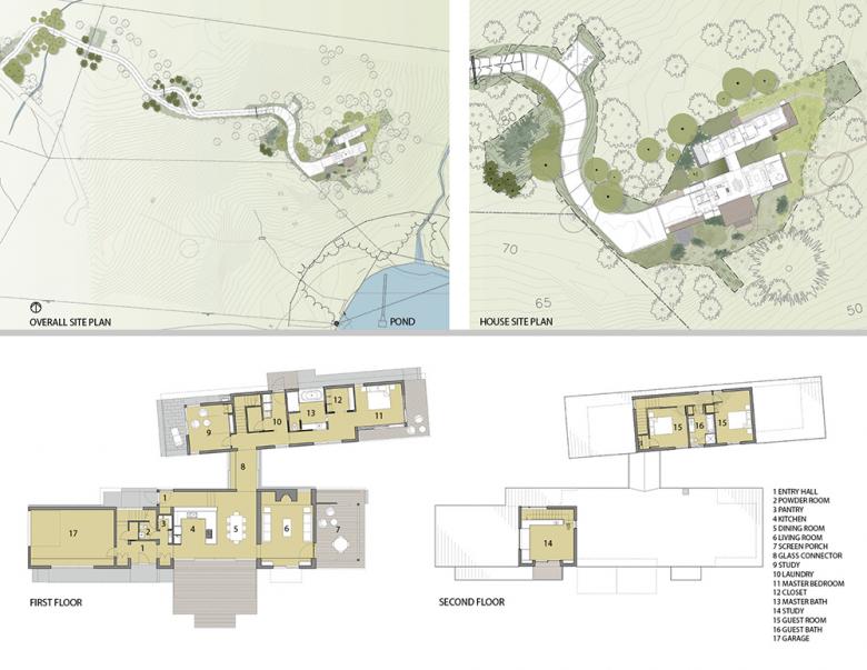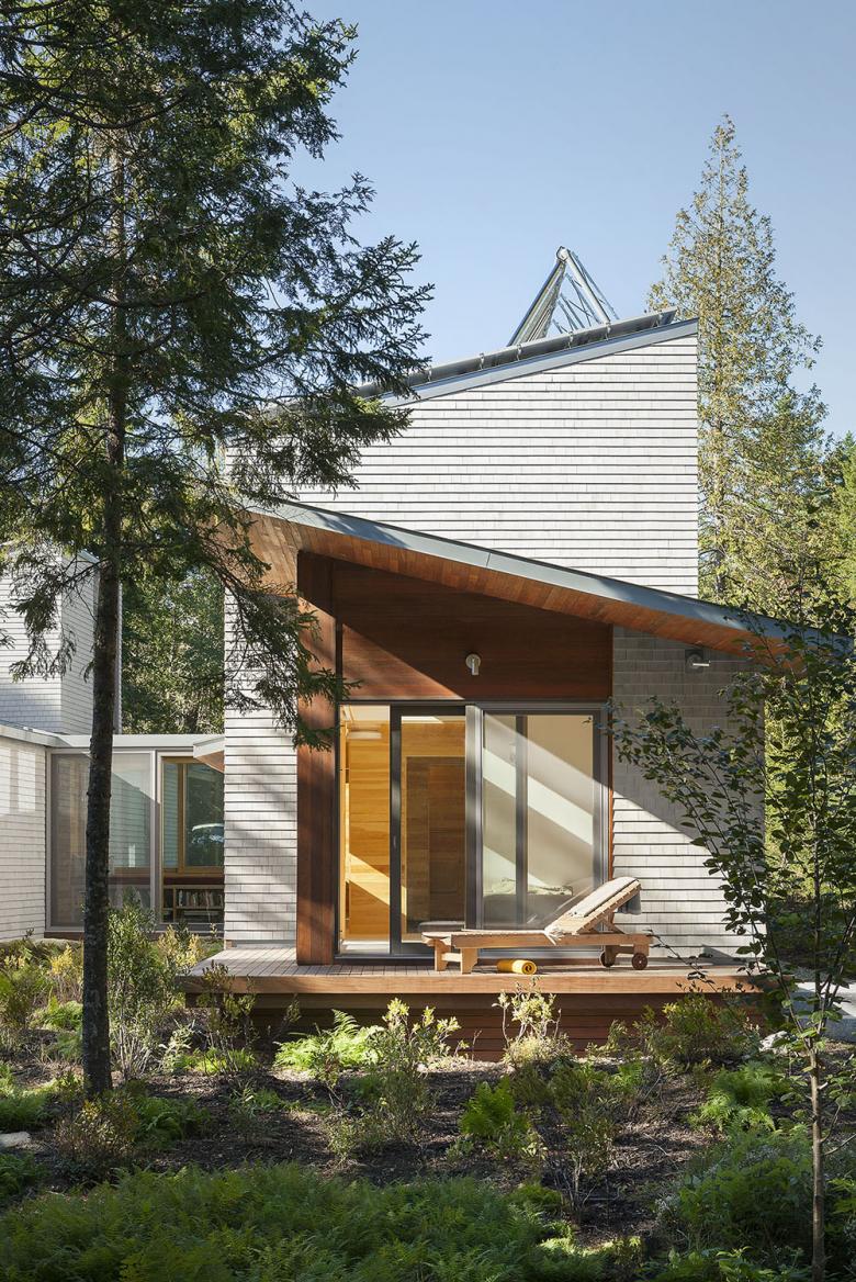 The design is a simple house with two wings, one for living, the other for sleeping, and a limited palette of natural materials: stone, wood, metal and glass. The building forms are simple. They touch the earth lightly and reach out to embrace the natural setting. The roofs lift up to open the house to the sun and views of the mountains and pond. Overhangs shade the summer sun.  Rooms are modestly sized, with generous amounts of natural light. Exterior decks cantilever over a landscape of ferns and moss. Pondicherry was made by hand with sustainable materials and produces 38% more energy than it uses.