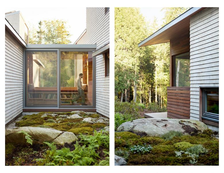 The architecture of Maine, at its best, reflects the simple power of the landscape. We are bounded by the ocean on one side and the mountains on the other. Natural materials can’t help but find their way into the buildings: granite from the islands along the mid-coast and white pine from the sustainable forests up north. Pondicherry is built of granite and wood, a simple house sitting lightly on the land. The base of the house is granite; the form of the house is wood. Native ferns and moss grow around and under the house, rooting it to the landscape.