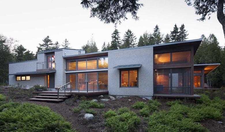 The owners wanted a small house that touched the earth lightly. They are foresters and wanted the interiors to be made with all clear pine from their sustainable forests. Conservation easements required that the house be sited 150 feet from the edge of the pond. Minimal clearing of the forest was allowed. The Design Challenge was to create a new way of living on Mount Desert Island, which had been a retreat for this family for over a century. They named the house Pondicherry, a new settlement, to describe their new way of life on the island, which sought to live in harmony with the National Park surroundings vs. the large cottages of Northeast Harbor where they had spent their youth.