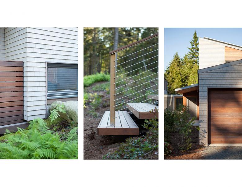 View of IPE and white cedar shingle siding, cable rail handrails, and IPE garage door