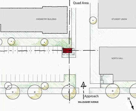 The Pratt security kiosk is situated at the main entrance of Pratt Institute's Brooklyn campus. It is a point of reference for the entire campus and requires 360° visibility of the surrounding area. The first step in the design focused on the specific location for the kiosk and a variety of axial conditions and site references were influential. The size was determined by its simple, yet important functions, and the roof overhang offers protection to those interacting with personnel at the kiosk. The multiple functions of this structure include protecting those who wait for the shuttle buses that operate between the campus and transportation hubs nearby.