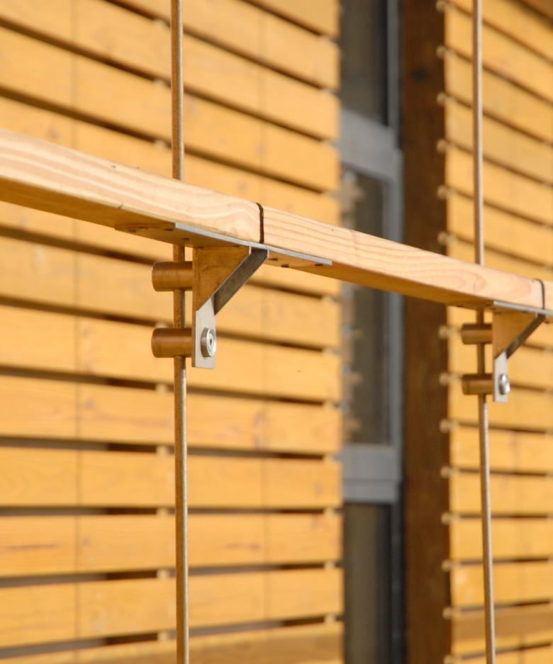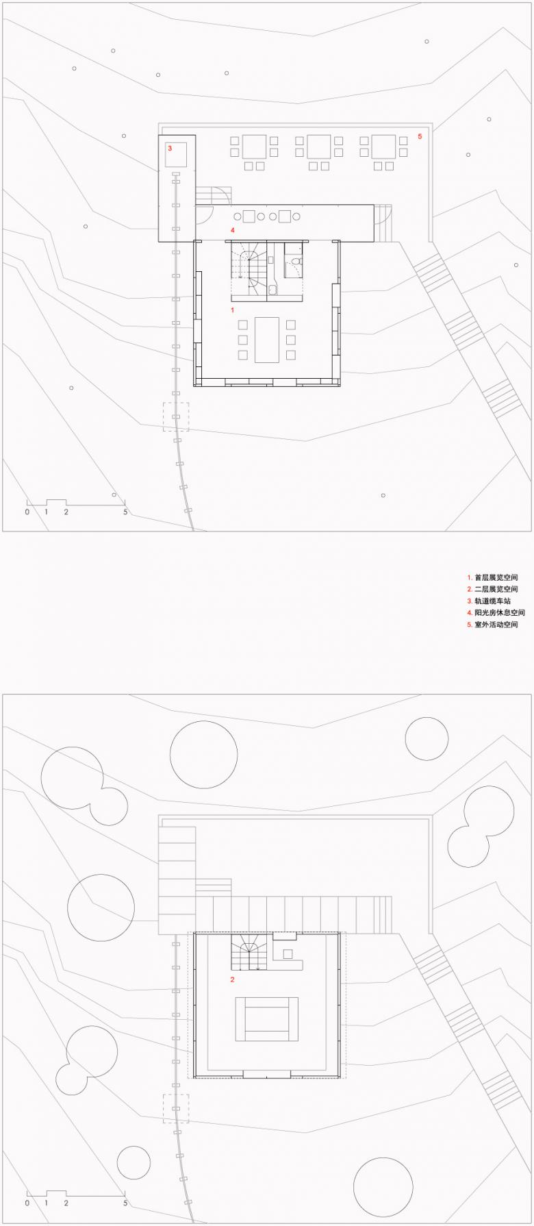 The pavilion is placed among the trees and elevated above the sloping ground on pile foundations. Since the site was not accessible for a crane truck or other heavy machinery, all parts of the prefabricated building were planned in terms of ease of transport and for manual assembly. A small vehicle that runs on rails carried the parts from the valley to the site. Following completion, the vehicle is now used to transport supplies to the education centre.