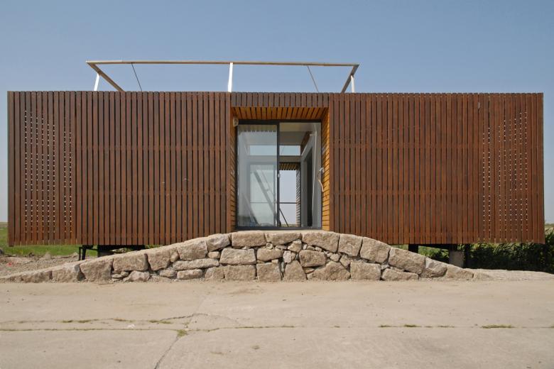 The boxes are extended by 1.3 metre deep balcony-modules, which act as shading devices for the window front from the high sun in summer, whereas the low winter sun allows solar gain for the self-sufficient pavilion. The roof of the pavilion is designed as a platform for watching the birds. The prefabricated spatial elements were delivered by truck and quickly assembled on site with the aid of crane truck. Motor vehicle access to the site allowed much bigger prefabricated parts than for the pavilion in Sichuan.