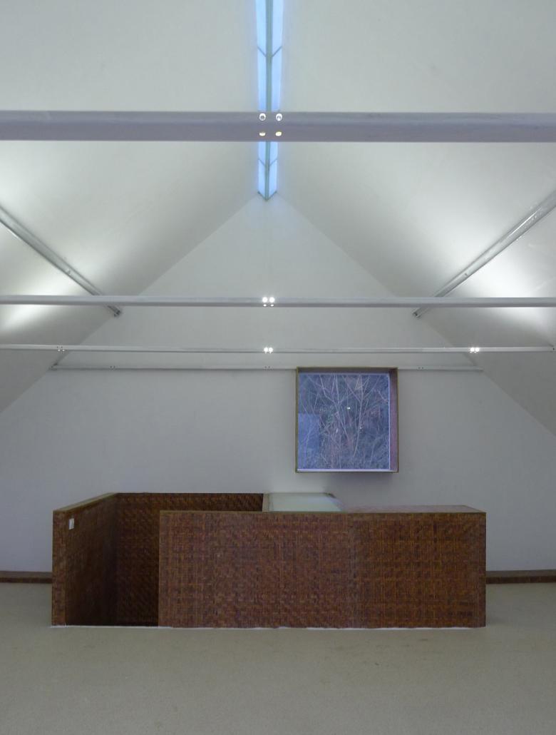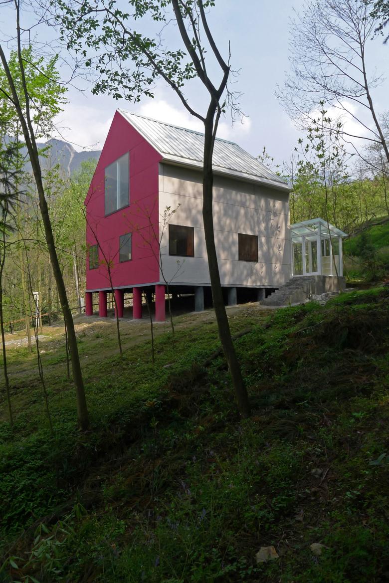 In the interior the architects used bamboo-laminated plywood for the staircase, kitchen partition, window frames and cabinets. The rest of the interior space is clad with gypsum board. On the second floor a huge window allows a view across the valley, and a skylight at the ridgeline provides the space with additional daylight. The exterior walls are light grey with the exception of the front gable. The imposing form of the two-storey structure with its steep saddle roof and pink gable faces the valley and acts as a signal for visitors to the village.