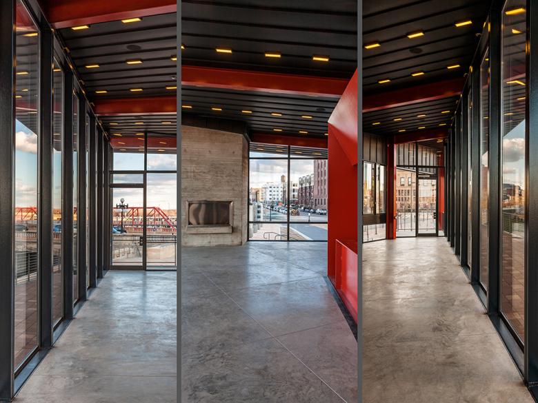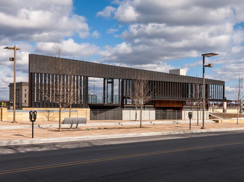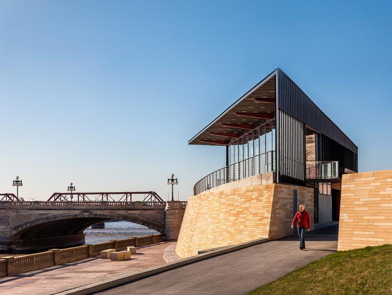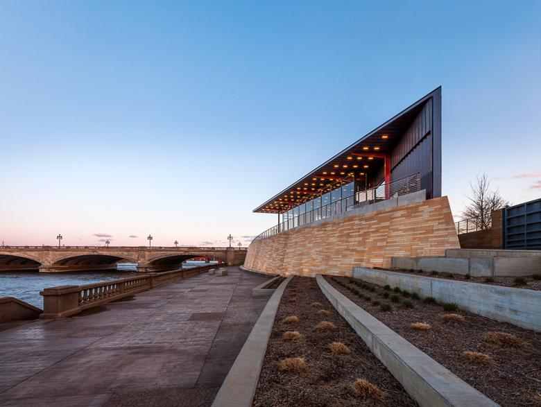 The City of Des Moines, along with the Principal Financial Group, master planned and developed a recreational trail and promenade along both banks of the Des Moines River in downtown Des Moines. The resulting City of Des Moines Principal Riverwalk is a significant piece of urban infrastructure that integrates new civic amenities with important flood control measures. The result is a nexus that ties together miles of existing recreation trails, and allows Des Moines citizens to directly engage the river. This pavilion is a café and restroom structure that rests on a gently sloping public plaza space located where the Riverwalk intersects Court Avenue – the main artery for the city’s historic entertainment district.