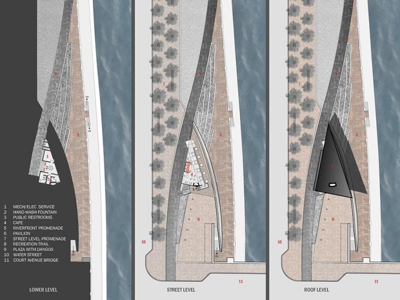The building program was developed working carefully with the client and user groups. A series of public meetings indentified the need for both a café and public restrooms at this location.  In addition, the need for a small public plaza was identified as well. Finally, some service spaces associated with the ongoing care and maintenance of the Riverwalk were needed. This project integrated those needs into a simple composition using the sloping site to minimize the building footprint.
