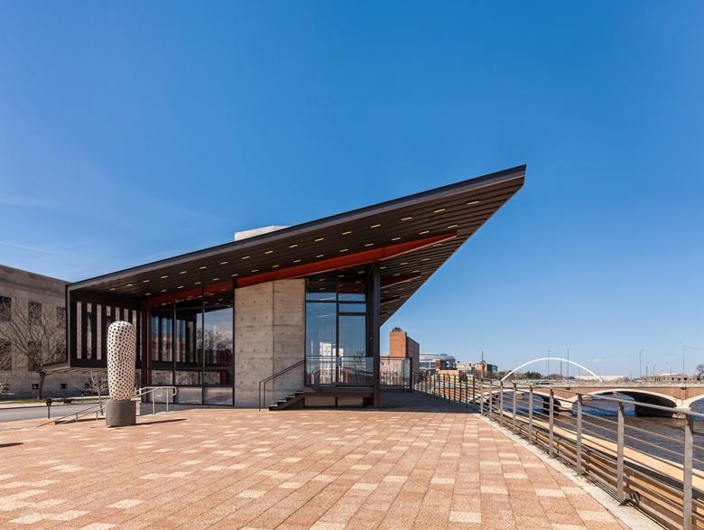 The pavilion was conceived as a transparent café space resting at the prow of a boat- shaped plaza with restrooms and service spaces housed underneath – as if excavated out of the plaza surface. The plaza is sloped upward to provide the café space panoramic views of the Des Moines River and the State Capitol building. This space is shielded by a folded zinc plane that provides solar and weather protection, as well as defining an exterior dining space. The lower service spaces are accessed from the downward sloping recreation trail that runs directly west of the building. This trail connects street level activity with the river level promenade and other trails running throughout central Iowa. The plaza is populated by a series of ceramic sculptures (5 Dangos) developed in collaboration with artist Jun Kaneko.