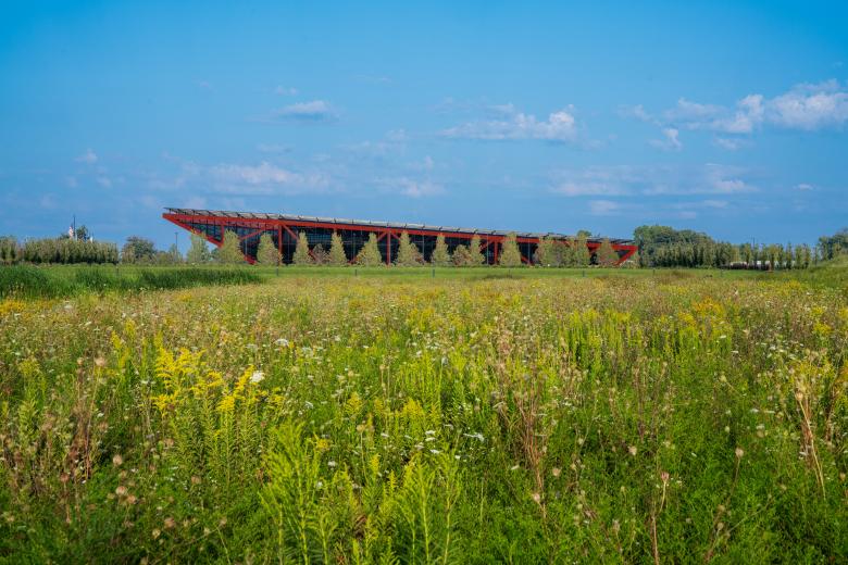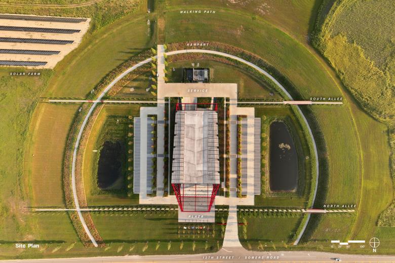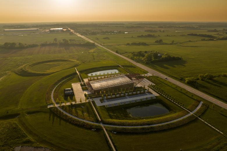 The 17.5-acre site was largely agricultural. Some regrading was required to realize the landscaping and it was largely achieved through the excavation for the basement. The landscape was developed to complement the building, its basic military idea, and as a place for the community to enjoy its walking paths. The landscape design utilizes native species reclaiming what was once prairie.