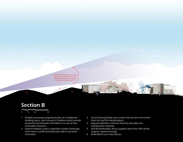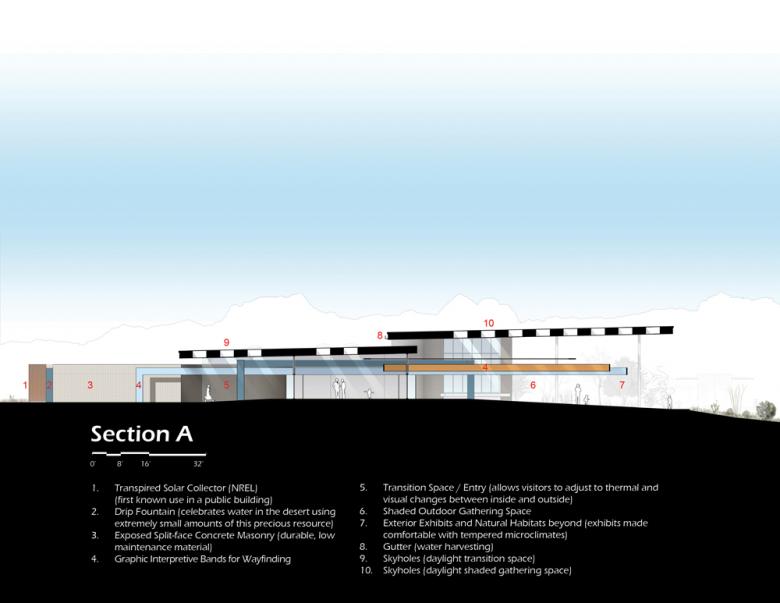 The Center provides a primarily outdoor experience that is designed to instill in individuals a sense of personal responsibility for the land's well-being. The architecture expresses environmental conservation, is responsive to climate and environment, and demonstrates appropriate desert design. The goal is that visitors will go away with a new understanding of conservation, buildings that respond appropriately to their environment, and energy conserving practices, products, and ideas that they can use in their personal lives.