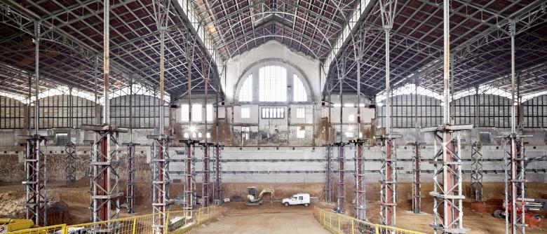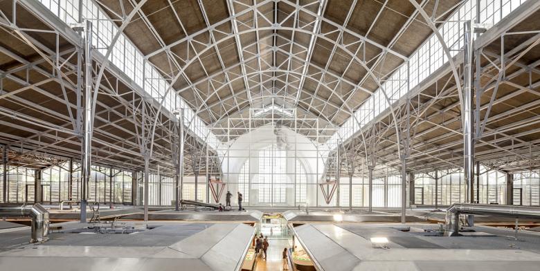 We conserve and repair the beautiful structure that supports that roof. Beneath, we dig into the site to introduce new services that complement sales activity: logistics, parking, installations.